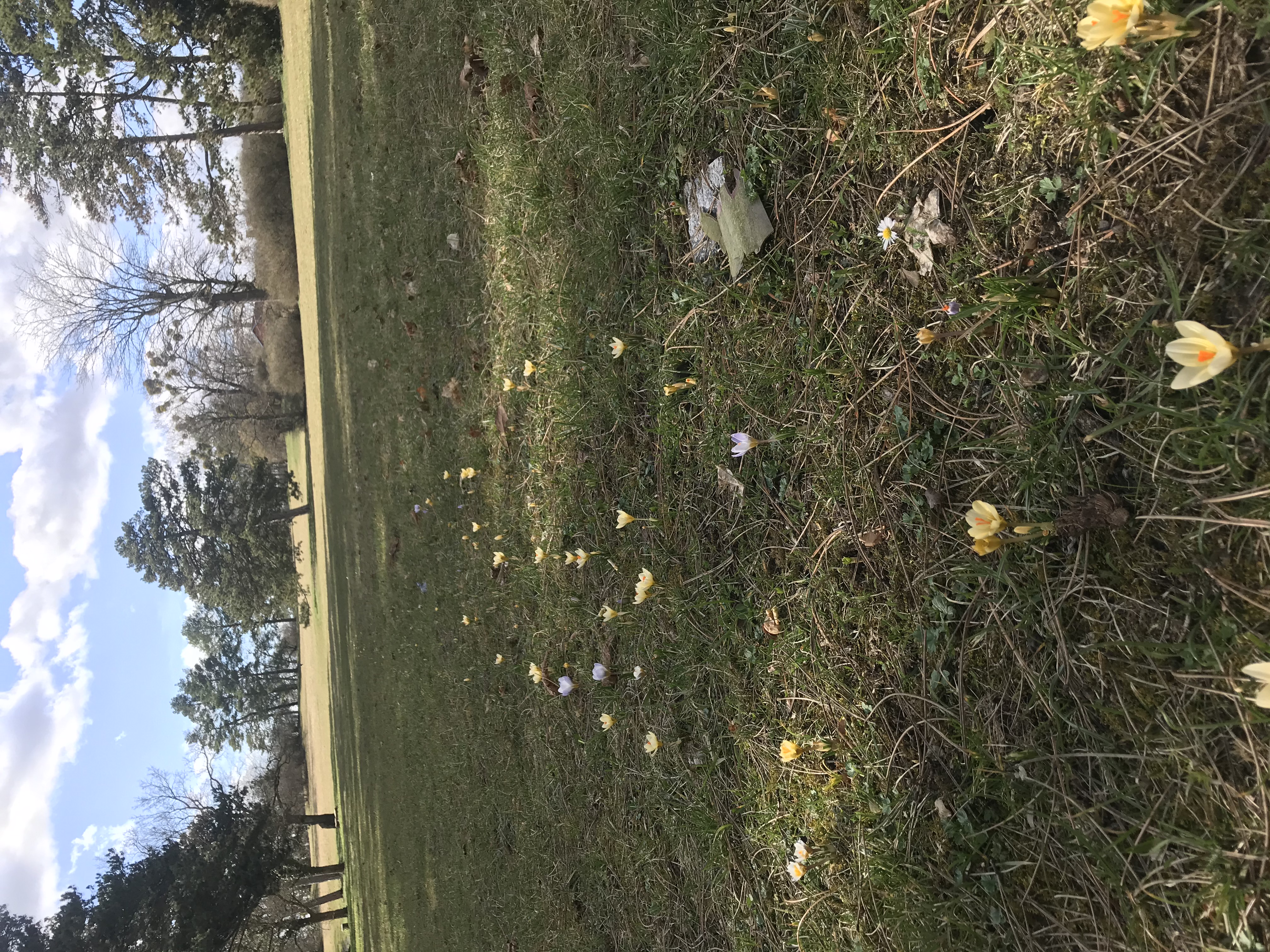 Fotografie z jara 2020, obrys hradu je lehce patrný. Vzhledem k nepřízni počasí a teplé zimě vykvetly krokusy nerovnoměrně. Snad to bude v zimě 2021 lepší!